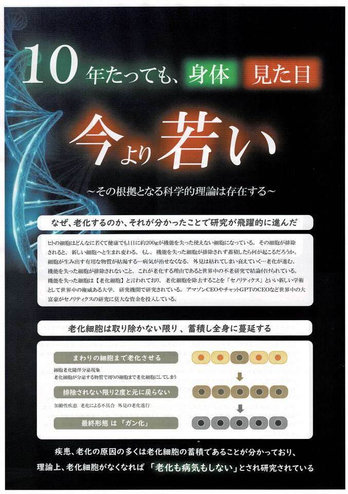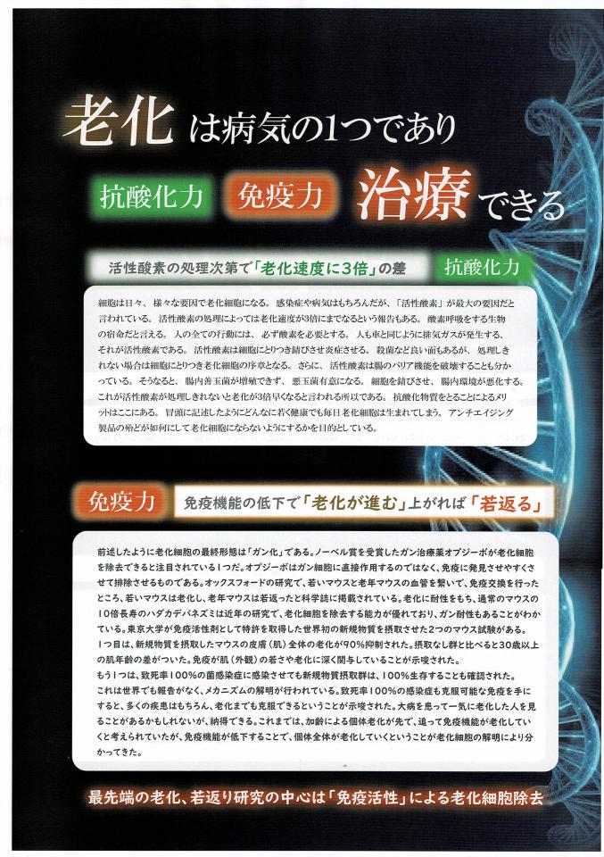 老化細胞を取り除かない限り、老化細胞は蓄積し全身に蔓延しますので、老化細胞が除去できれば「老化も病気もしないで若さを維持できる」のです!